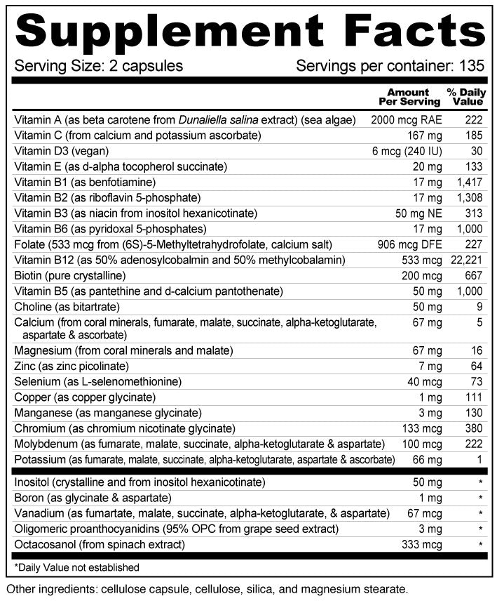 Two capsules of Daily Energy Multiple Vitamin contain 533 mcg of the coenzyme forms of B12 (methylcobalamin and andenosylcobalamin) and 533 mcg of folate from co-enzyme Quatrefolic®. These are beneficial amounts of true quality nutrients, providing support for nerves, red blood cells, mood, and stress.*